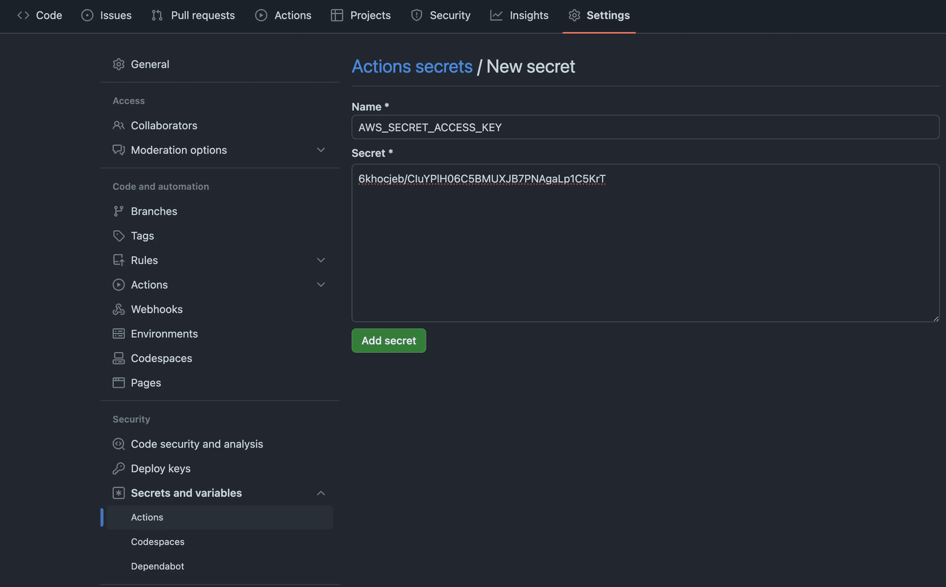 - Enter AWS_ACCESS_KEY_SECRET as the value obtained earlier.