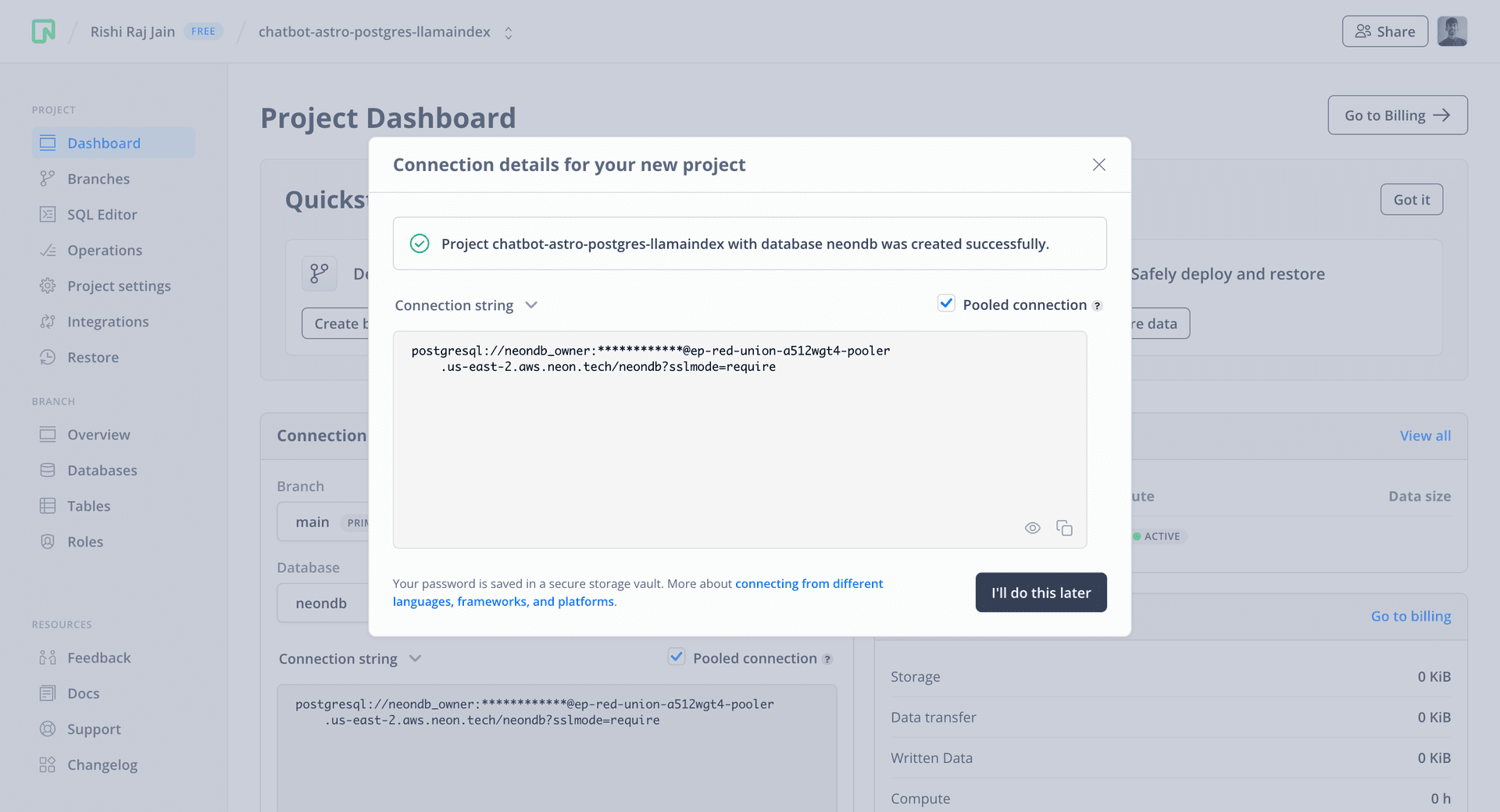 Save the connection string somewhere safe. It will be used to set the the POSTGRES_URL variable later.